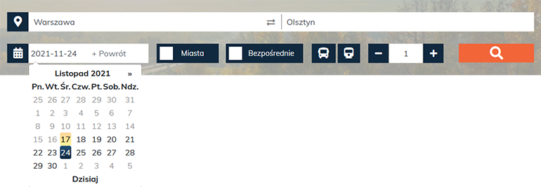 d. Wybierz za pomocą kalendarza datę wyjazdu oraz ewentualnie datę powrotu aby kupić bilet wyjazdowy oraz powrotny.